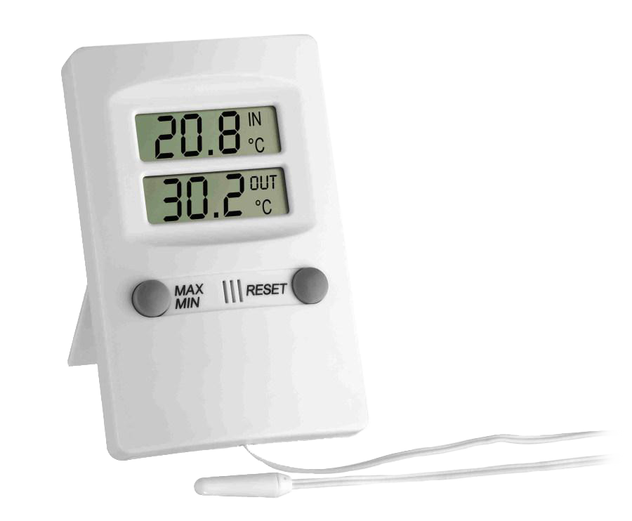 - digitální teploměr s kabelovým čidlem měří vnitřní i venkovní teplotu, zaznamenává minimální a maximální teploty do své vnitřní paměti