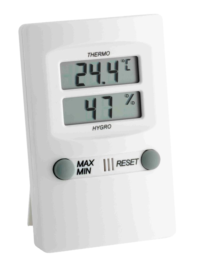 - teploměr je možné zavěsit na zeď či postavit na rovnou podložku díky výklopnému stojánku